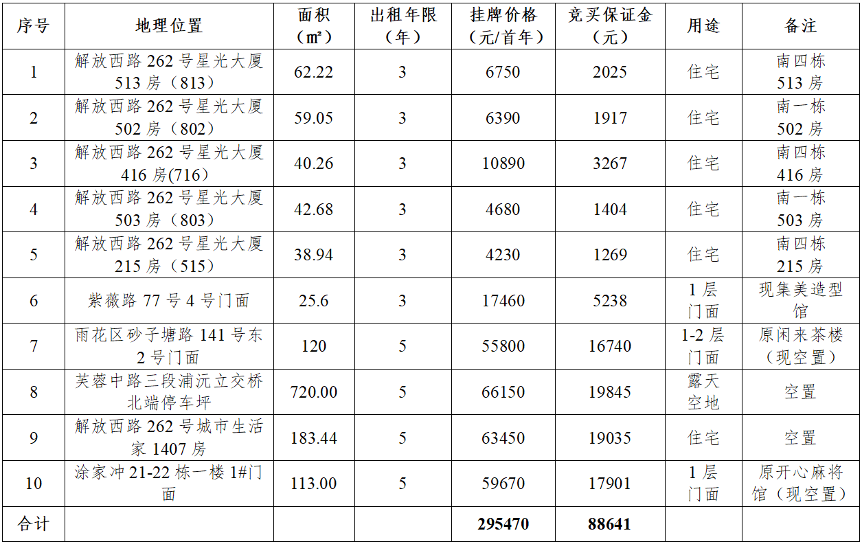 受委托,我司將于2025年12月5日14:30開始在長沙公共資源交易中心二樓開標室對長沙市解放西路、砂子塘路、湘府西路等42處經營性資產租賃權(第二次)進行公開拍賣,本次剩余招租標的共10處,起拍價共29.547萬元/首年,競買保證金金額詳見長沙公共資源交易中心拍賣公告公示內容、標的清單。 競買人資格條件:具有完全民事行為能力的自然人,以及依法登記設立、有效續存的企業法人,均可憑有效證明辦理報名手續;原承租人須結清應付租金后,由委托人確認后方可報名。 展示時間地點:2025年12月3日至4日9:00-16:00,標的所在地進行展示。 競買登記報名時間地點:2025年12月3日至4日9:00-16:00,長沙市芙蓉區馬王堆中路248號長沙聯合產權交易所有限公司一樓。 報名步驟: (1)首先完成長沙市公共資源交易數字證書及簽章辦理,湖南CA咨詢電話:4006682666; (2)有意競買者請在長沙國有資產電子交易系統上注冊、辦理網絡報名手續; (3)前往競買登記報名地點辦理線下競買申請登記手續,逾期不予辦理。 競買保證金:請繳至【賬號:競買人需使用IE瀏覽器登錄并注冊“長沙國有資產電子交易系統http://gyzc.csggzy.cn/TPBidder”,點擊報名生成保證金子賬號(繳納保證金時備注項目名稱)。】繳納截止時間為2025年12月4日16:00(以到賬為準)。 咨詢電話:0731-82710283 王女士 標的詳情請關注微信公眾號“長沙聯交所”或“長沙市拍賣行”